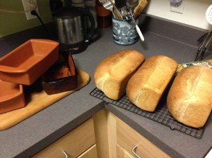 In anticipation of the storm, Sam was able to bake bread. He makes whole-wheat loaves using King Arthur (local!) flour. The bread pans are the Alfred Bread Pan from Tufty Ceramics. The two brown pans are the new ones I gave him for his birthday. The blackened pan is over 20 years old – his father used it to bake similar wheat loaves for his family.