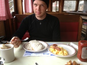 So we found the place to be pretty empty, but we were also there very early (8:15, they open at 7) because our hungry bellies don’t respect Daylight Savings Time. By “our” I mean Pidi and Molly – who graciously awoke us at 6:15am with demands for breakfast. Being there early, we had our choice of any booth in the place. By 9am, the booths were full and the counter stools were also filling up. We ordered from the menu of standard breakfast faire – I had a “Hunter’s Breakfast” with eggs, sausage, bacon, french toast, and fried potatoes, $9.50. Paid an extra $1.95 for real Vermont maple syrup. Sam ordered Biscuits and Gravy and a scrambled egg, $7.95.