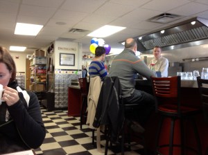 Today we had a good breakfast. We drove down the hill to the Lebanon Diner (Yelp) that is located on the corner of the pedestrian mall in Lebanon. The Leb Diner is a red0-retro. The Quechee diner and 4 Aces used to be dining cars and were refit to modernize the kitchen and increase the size of the service areas. The Leb Diner was never a diner – it’s just a first-floor retail spot on the mall in Lebanon. The pressed tin walls and the stainless steel counter are afterthoughts.