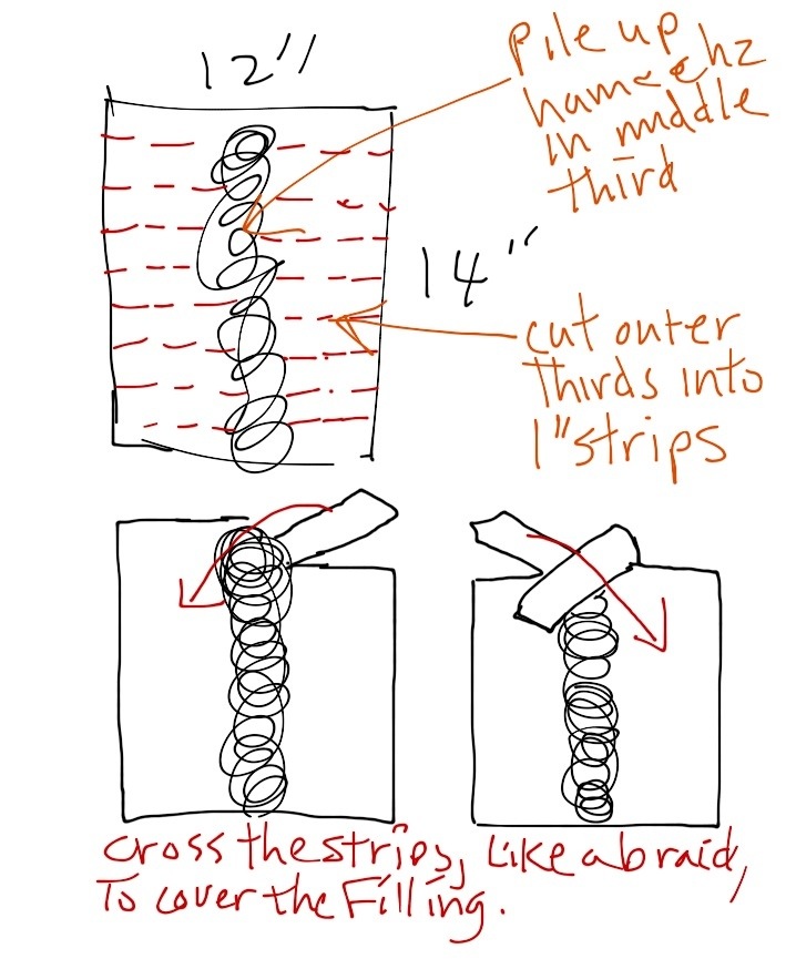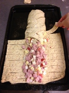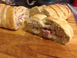Reserve a golf-ball sized piece of dough. Roll the remaining dough out to a 14″x12″ rectangle. Transfer the dough to an oiled baking sheet. Pile the cubed meat, apple and fruit along the middle third of the dough. Cut the outer thirds of the dough into 1″ strips. Fold the strips over to cover the filling, like making a braid. Roll the golf-ball sized piece of dough into a disk, and use it to “plug” the sandwich on the end where you started braiding – the filling won’t fall out this way.