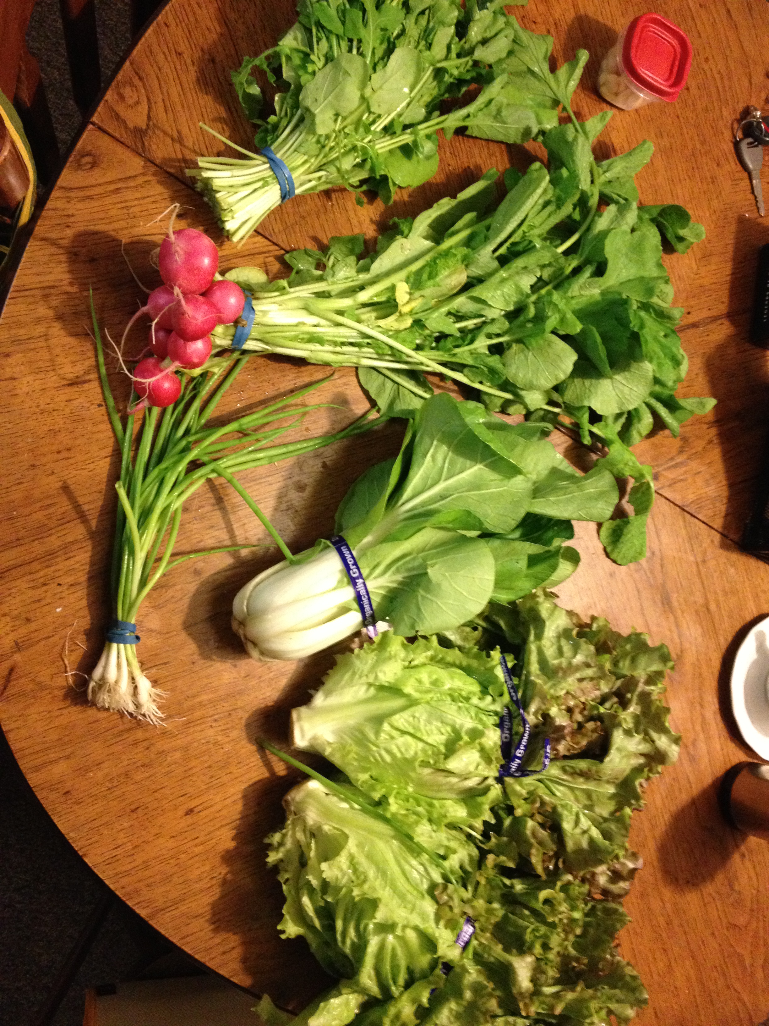 After months of waiting, we FINALLY have a CSA and we’re getting shares! I’ll be posting pics of our CSA deliveries from Cedar Circle Farm as they come in – look for the tag This Week in Veg. We got arugula, radishes (with greens), spring onions, bok choi, and two heads of lettuce.