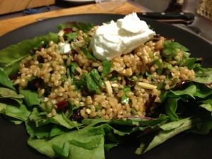 This is a modified recipe from Mark Bittman’s How to Cook Everything called wheat berries with walnuts. I needed to get rid of a whole bunch of beet greens before they went swishy, so I added them. I think given a nice color.