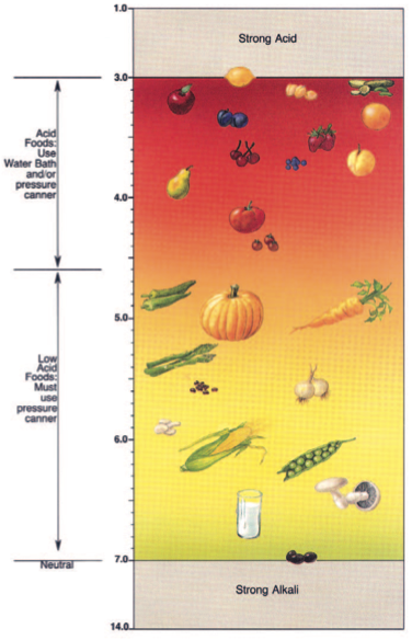 Water Bath or Pressure Can? Technically, any food will be sterilized using pressure canning. But with sweet, salty or acidic foods, pressure canning is overkill. The amount of heat and pressure applied to the food to get it sterile will break down tender fruits, turn pickles into mush, and make jams hard and unspreadable. If your food is really sweet, salty or acidic, then water bath can it – it’s gentler on the food. There are some foods that are marginal in their sweetness, saltyness or acidity. For example, tomatoes are acidic, so whole tomatoes can be water bath canned, but when you cook tomatoes (heat reduces acid) with onions (low acid), and bell peppers (low acid) to make tomato sauce, you may reduce the acid enough to require pressure canning. Some fruits are acidic when unripe and less acidic (more sweet) when ripe (e.g. apples, pears) so the ripeness of the fruit may necessitate pressure canning. The solution is to test the acidity using pH strips or a pH meter and either add lemon juice or vinegar to bring the acid up and water bath can, or to pressure can the low-acidity food. According to the USDA Complete Guide to Home Canning, (Guide 01, page 4) the cutoff point is 4.6 pH. Lower than that (more acidic) and your food is fine to water-bath can. More than that (less acidic) then your food must be pressure canned. (Note most foods fall into the range of 3.0 to 7.0 pH, and few foods are alkali or basic and have pH between 7.0 and 14.0.) Additionally, any food with meat, regardless of how acidic, MUST be pressure canned. So, if you add italian sausage to your tomato sauce, it MUST be pressure canned.