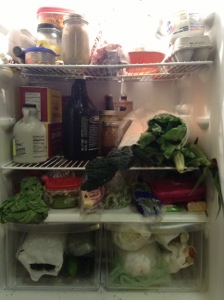 Middle shelf: Growler of beer from Harpoon. Kale, Bok Choi, 6 ears of sweet corn. 3 red heads of cabbage. 1 green head of cabbage. 1 quart homemade Sauerkraut.