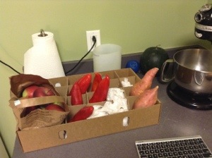 Peck of local apples. 5 Carmen peppers to be pickled. 4 peaches. 2 sweet potatoes. a seedless watermelon.