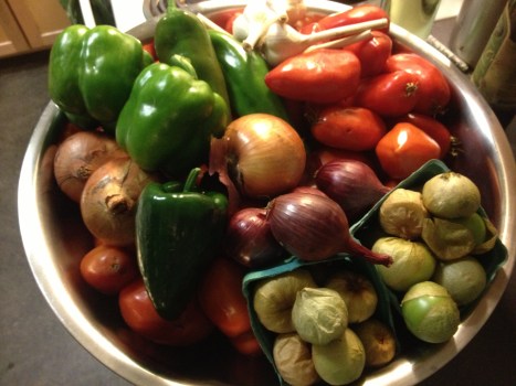 Going back to the earlier post on when to water bath can vs pressure can, tomato salsa is one of those marginal products that, depending on the ratio of onions/peppers/garlic (low acid vegetables) vs tomatoes (high acid vegetables), the overall acidity may be too low to water bath can. In this recipe I add 2 cups of lemon juice to ensure that, no matter how many peppers and onions I add to the salsa (and I like a LOT of peppers in my salsa) the acidity will certainly be high enough to water bath can my salsa. Good thing too, because pressure canned salsa gets much too over-cooked and is more like a smooth taco sauce than a chunky salsa. In addition to tomatoes, I add tomatillos to my salsa. Tomatillos have more pectin than ripe tomatoes, and so they add thickness and body to the salsa as it cooks.