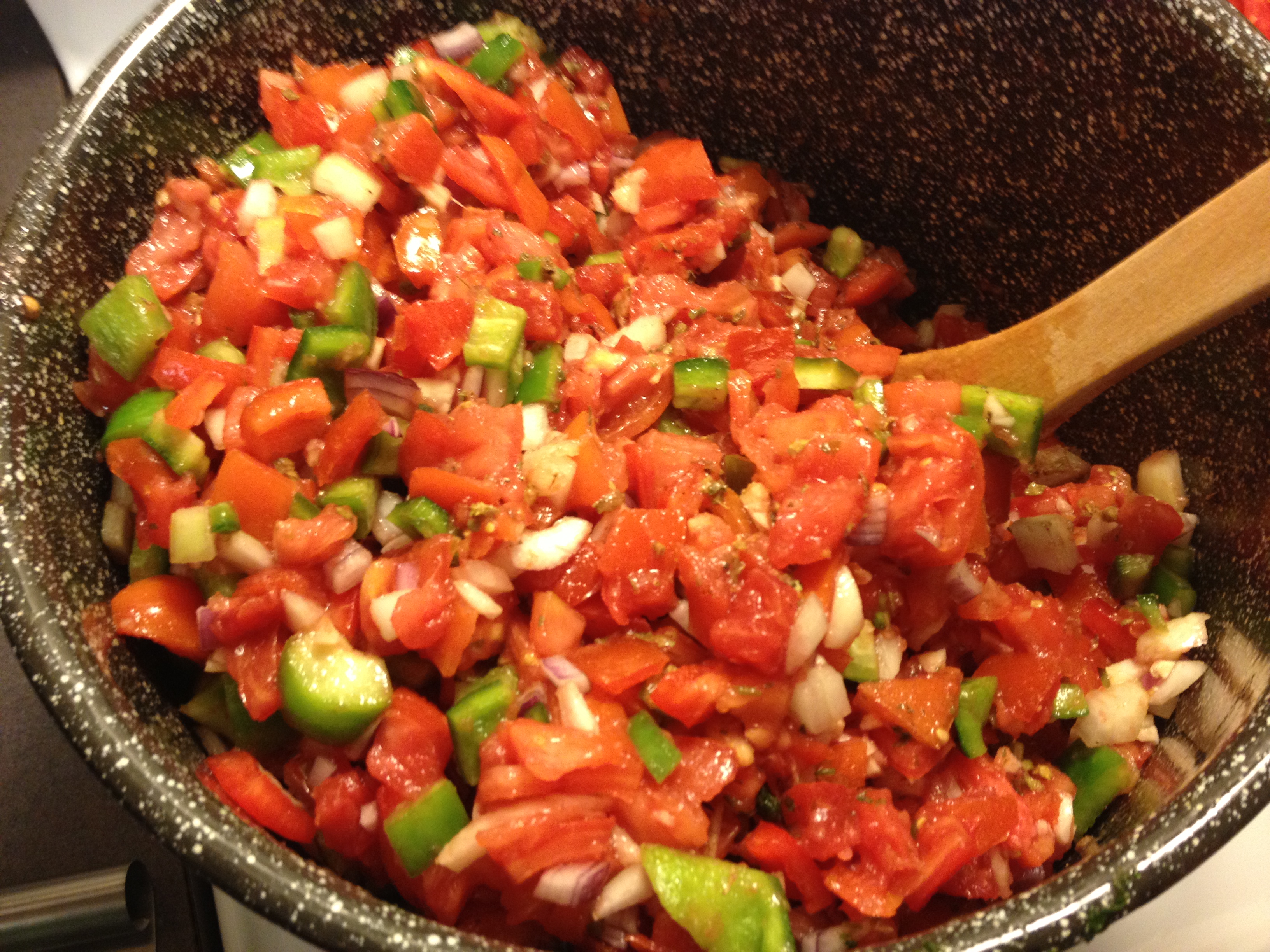 We did most of the pepper, onion and garlic chopping the night before and the WHOLE FRIDGE reeked of onions. I’m not doing that again next year. But it did save us about an hour of chopping.