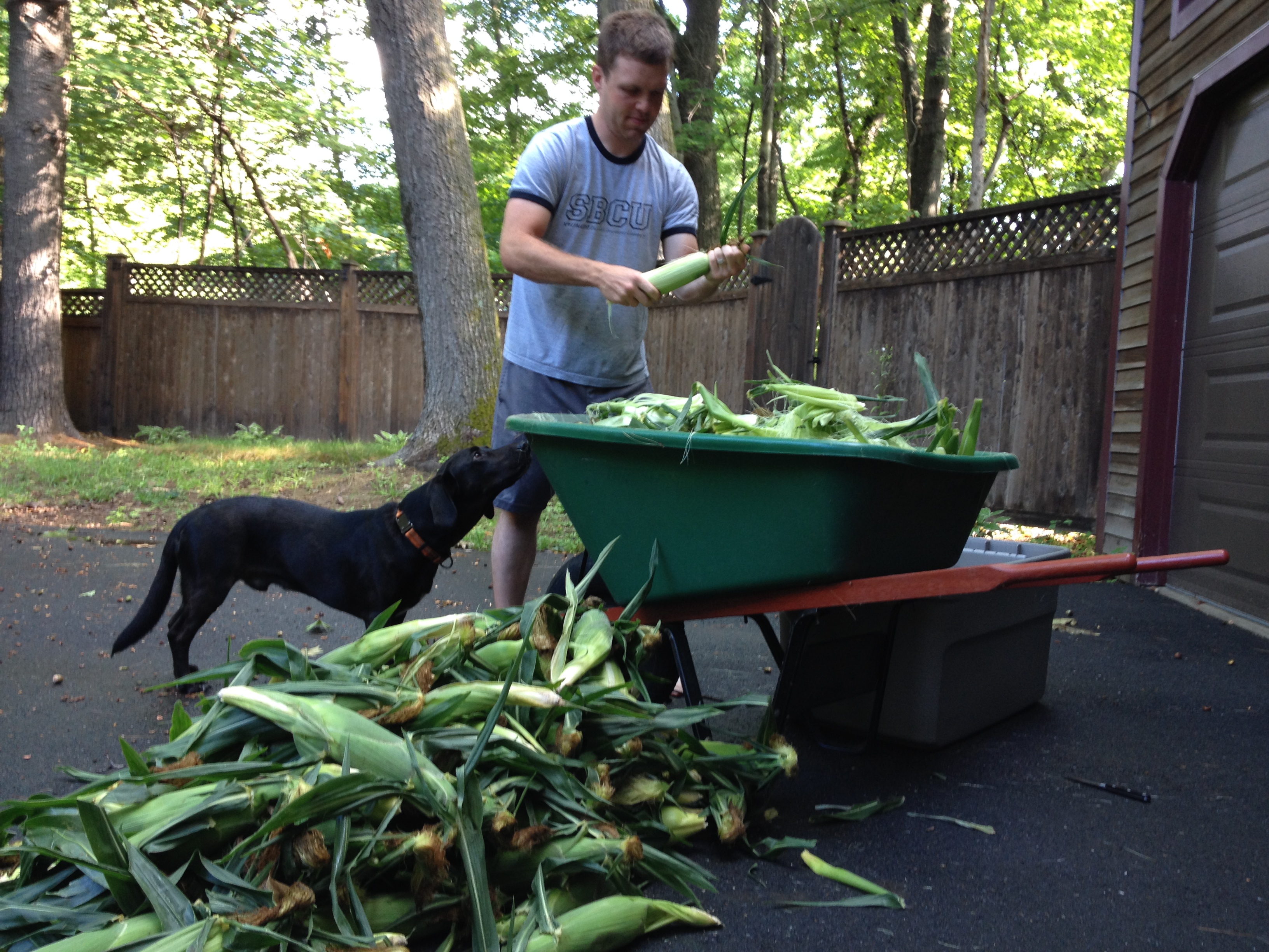 Aw… Shucks September 2, 2014 by Addi Leave a comment We’re shucking the corn. Pidi tried to help but lacked thumbs. We shuck in the yard so we can hose away the corn silks. They get everywhere.