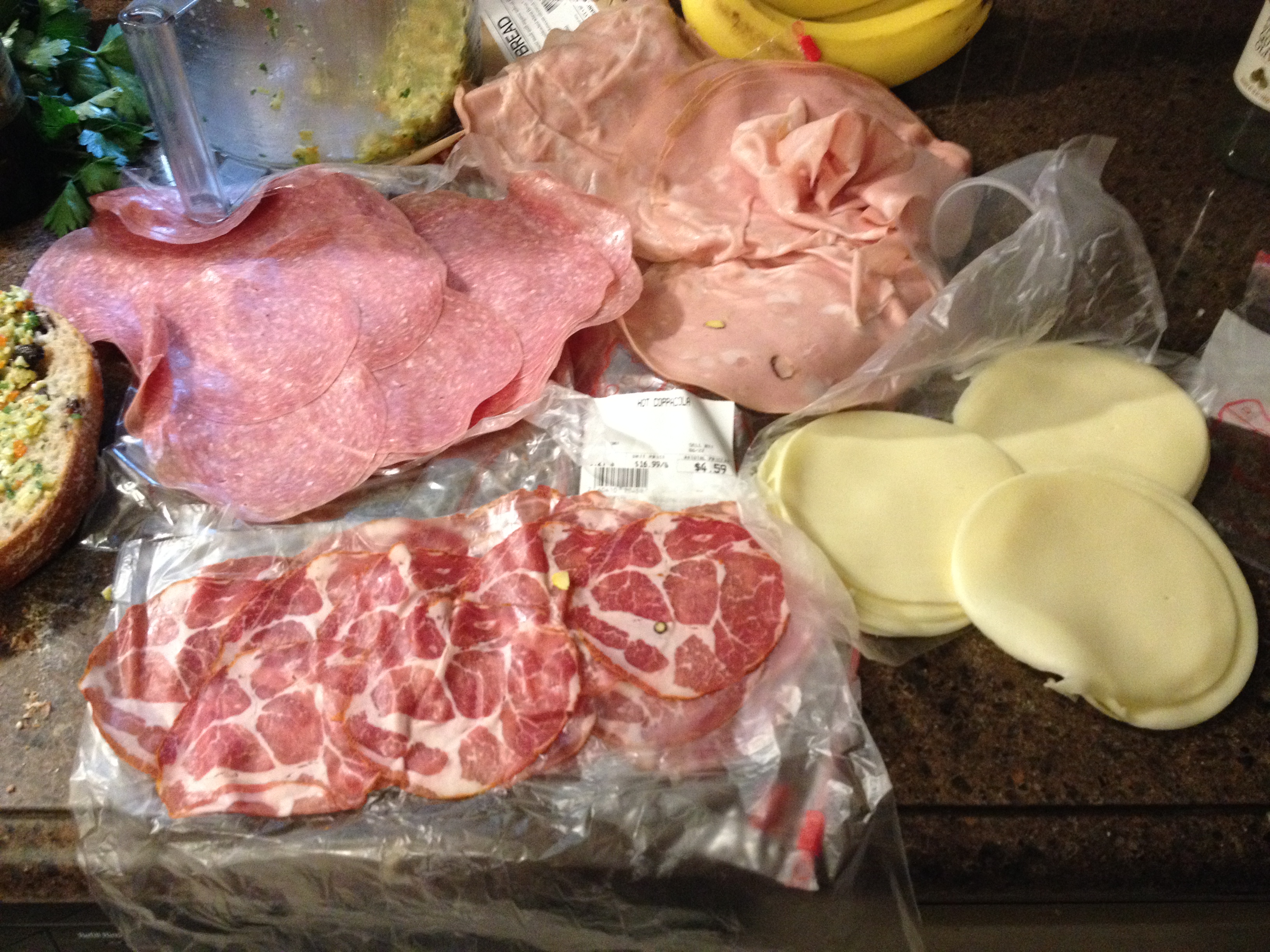 Ingredients: 1/2 lb mortadella, 1/2 lb salami, 1/4 lb hot capricola, 1/2 lb provolone cheese. All sliced thin, but not paper thin. (Not shown: olive salad and a large round loaf of crusty bread.)