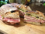 Layer meats and cheeses, and remaining 1/3 of tapenade. Weight sandwich and press for 30 minutes. I’m using the Holy Trinity: McGee, Bittman and Child. Slice into wedges and serve. Wrap leftovers (ha!) and it gets a lot better after a day in the fridge and a trip to the office in your bag.