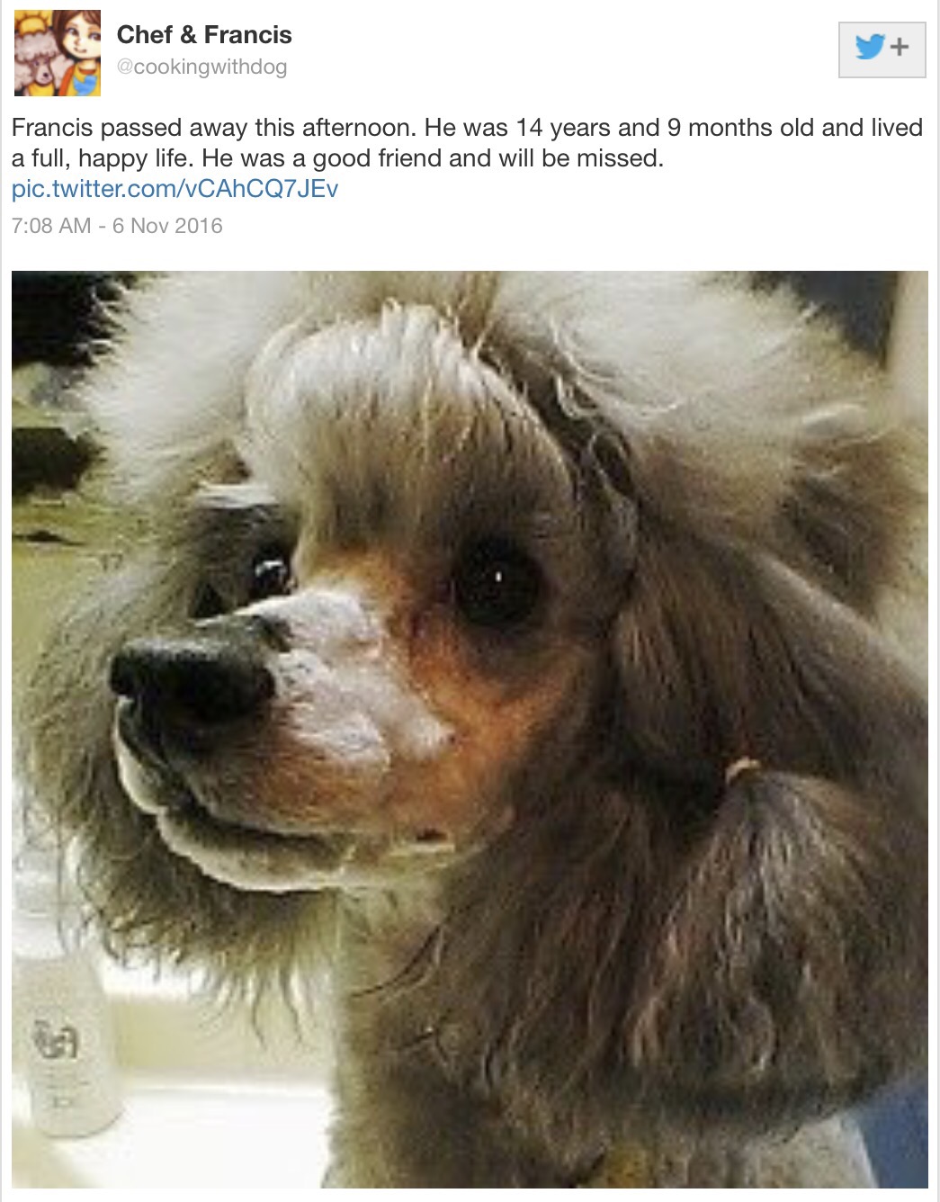 Rest in Peace, Francis. November 8, 2016 by Addi 1 Comment Francis and Chef helped teach me to cook Japanese food. Share this: Click to share on X (Opens in new window) X Click to email a link to a friend (Opens in new window) Email Click to share on Facebook (Opens in new window) Facebook Click to share on Pinterest (Opens in new window) Pinterest Like Loading... Related