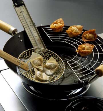 Tonkatsu has been a special dish in my family because it is a giant pain to deep fry food, so we only made it on special occasions like Christmas or birthdays. I remember mom and dad filling the wok with hot oil and setting this special grate on the side of the wok to let the pork cutlets drip oil back into the wok, like pictured below. When I make tonkatsu, I use a deep cast iron pot because I don’t own a wok. The cast iron pot weighs a ton, which means it has a lot of thermal mass, so keeps the oil at a more stable temperature when frying. I do a lot less fussing with the temperature. Set the heat, wait, and done.