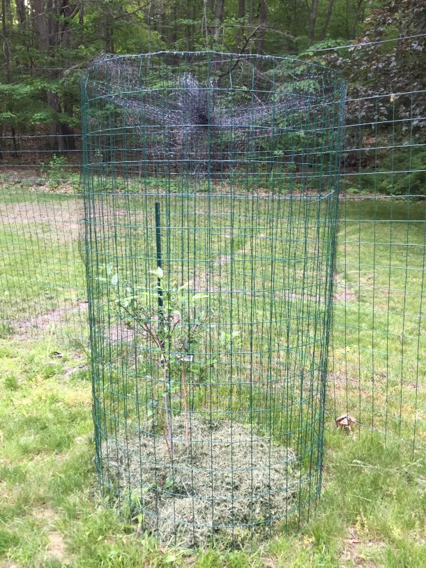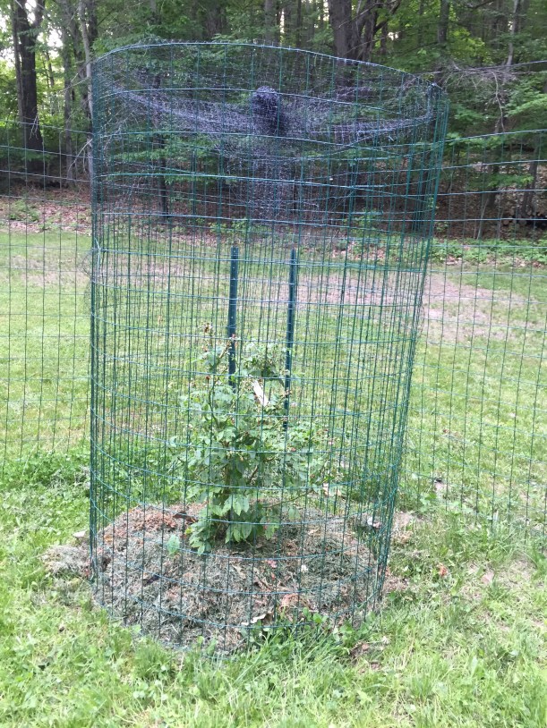My first line of defense was to put the garden fence around the bushes. That will keep the deer out. Next was to build bird netting cages to keep the birds at bay. I finished them this evening to good success. I recycled leftover garden fence into two cyllinders. Then I covered them with bird netting. Here is hoping I get a few cups of berries from my bushes.