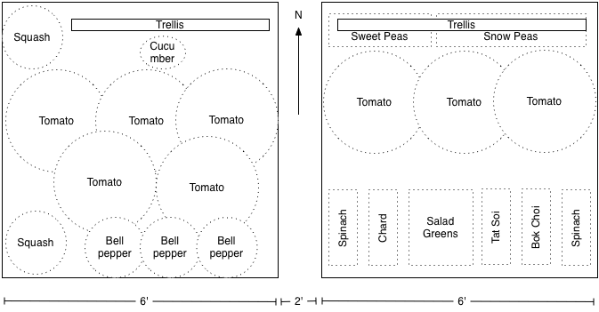 The left bed is partially planted. You can see the different seed beds and the pea trellis we put up. The right bed is taking longer to shape up because it’s mostly going to be full of transplanted tomatoes.