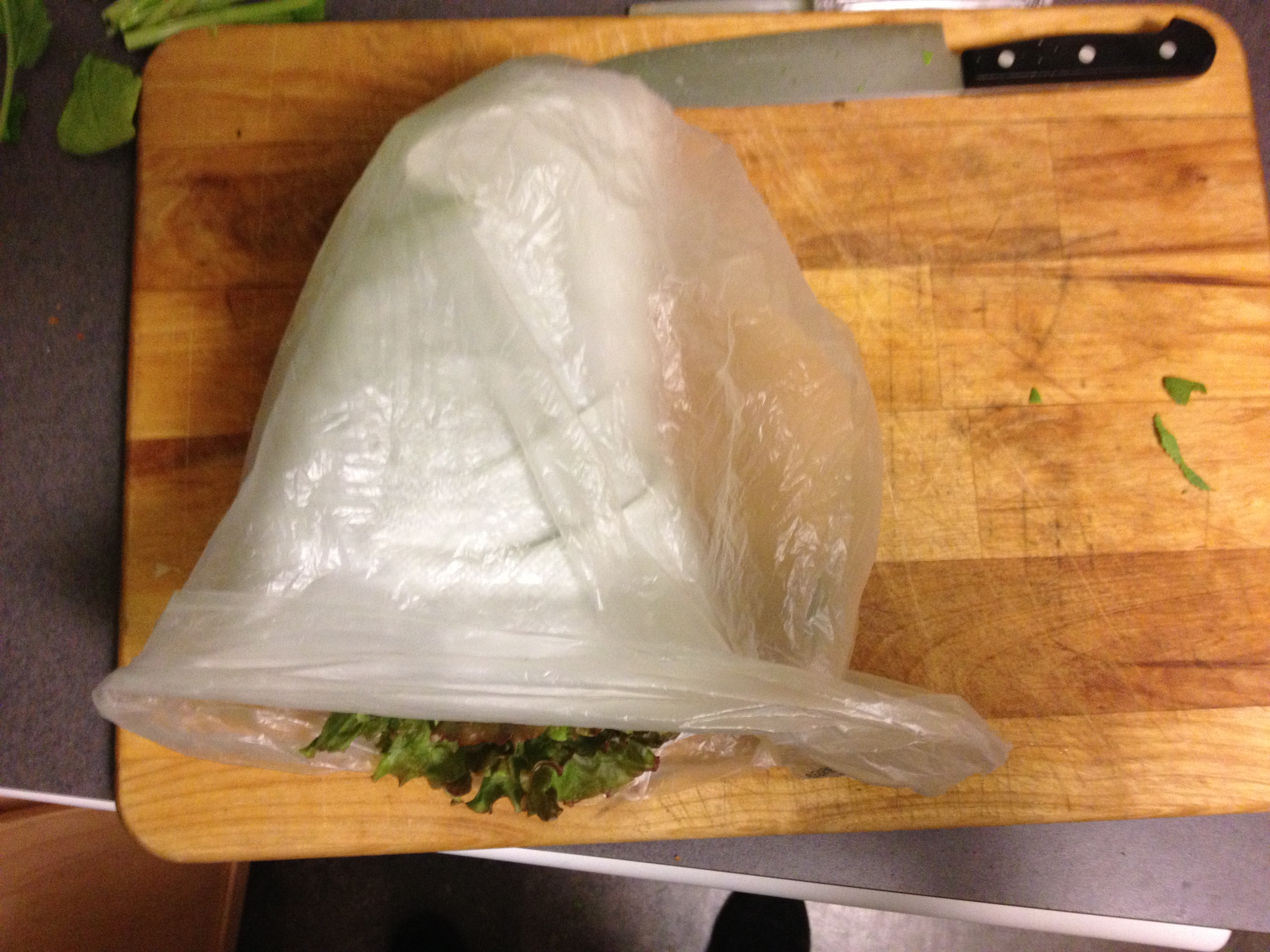 Most of these leafy greens will wilt and dry out if just put in the refrigerator. Compared to store-bought greens, locally-bought greens will stay crisp and moist much longer in the fridge. The local veg that I get in our CSA is often only 1 or 2 days out of the ground, while some veg in the grocery store may have been picked weeks before. For locally picked veg, by my accounts, you have about 2 days in the fridge with unprotected greens before they’re wilted and inedible. However, if you put a little effort up front, these vegetables will stay very crisp and moist in the fridge, without getting soggy and mildewy. You can plan to pick up your CSA on Friday and still have crisp veg to cook with on the following Thursday. It’s all about moisture control.